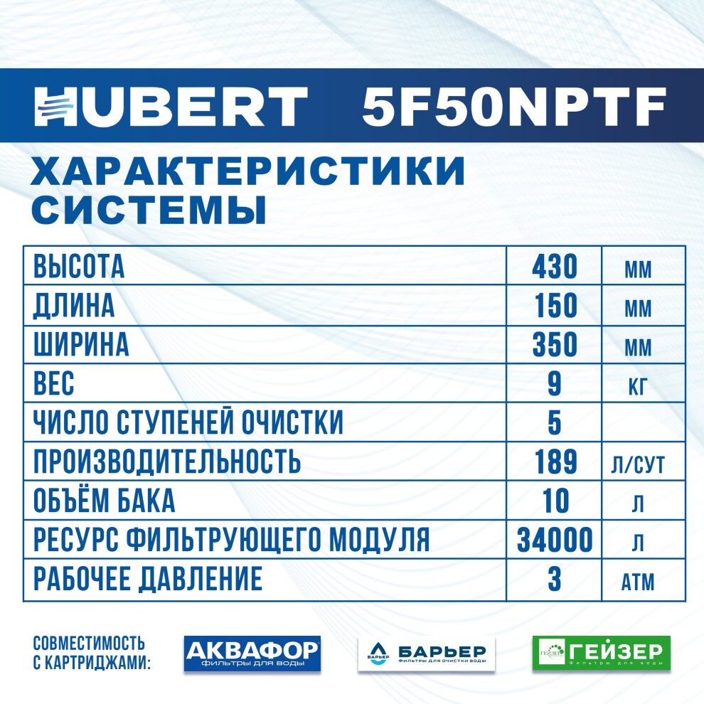 Данный фильтр разработан для использования в доме, встраивается под мойку на кухне. Фильтр с системой обратного осмоса очищает воду на 98-99%. Требуемое давление 0,5 бар. Вода проходит 5 степеней очистки: